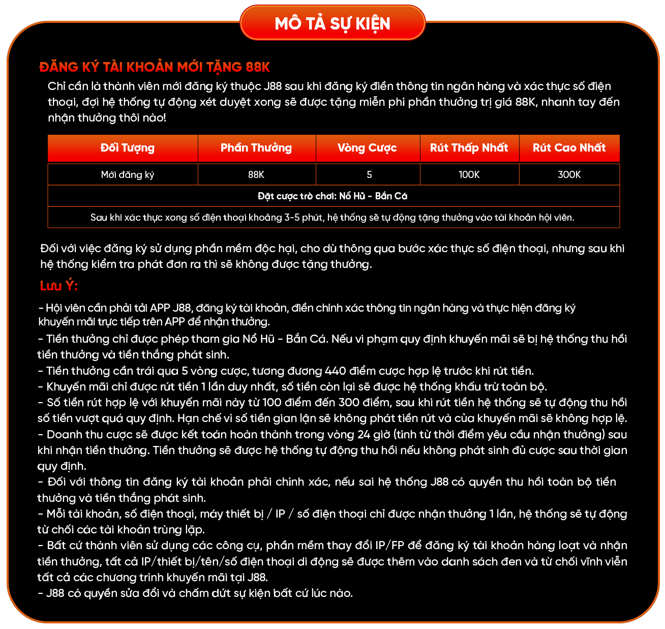 Hội viên cần phải tải APP J88, đăng ký tài khoản, điền chính xác thông tin ngân hàng và thực hiện đăng ký khuyến mãi VIP88K trực tiếp trên APP để nhận thưởng